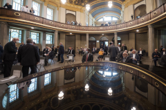 Der Kuppelsaal ist mit hochwertiger Veranstaltungstechnik ausgestattet, beispielsweise mit einem leistungsstarken Laserprojektor und einem Beschallungssystem, das präzise auf die akustischen Bedingungen des Gebäudes abgestimmt ist. Ein hochmodernes Rednerpult mit integriertem Display und einem